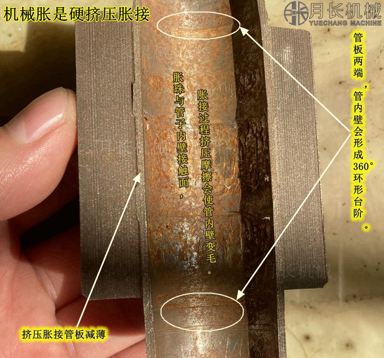 1、机械胀属于硬挤压胀接工艺,由胀珠高速滚压促使管子变形而实现胀接,1.1滚珠接触面胀接过程中会对管子内壁造成损伤;1.2滚珠末端没有胀接到的管子内壁会形成一圈台阶。液压胀工艺绝对完全避免此类现象!